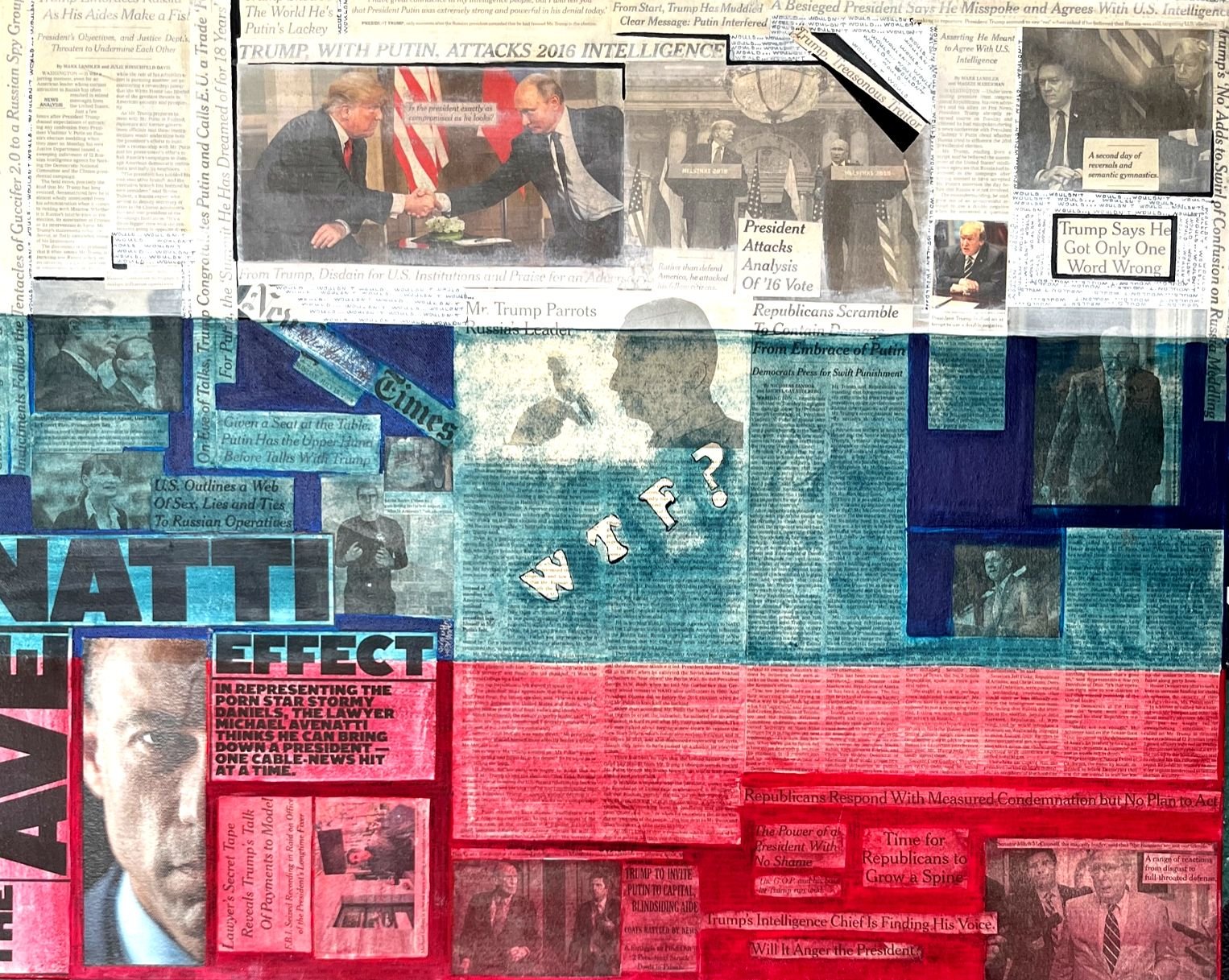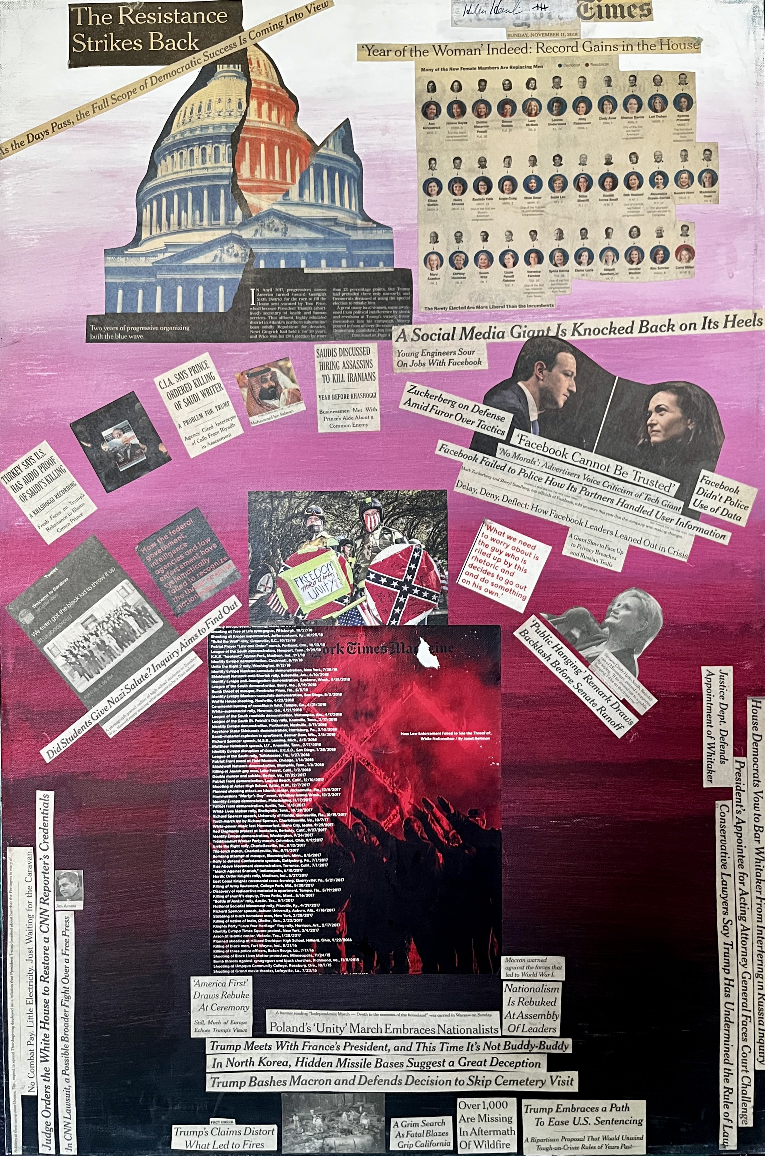 In 2018 I created 52 dated collages, one for each week of the year, using newspaper headlines to capture what was happening in America and the world. Over time the project expanded beyond politics to explore a deeper question; how do we move from reaction and rage toward wholeness and hope?