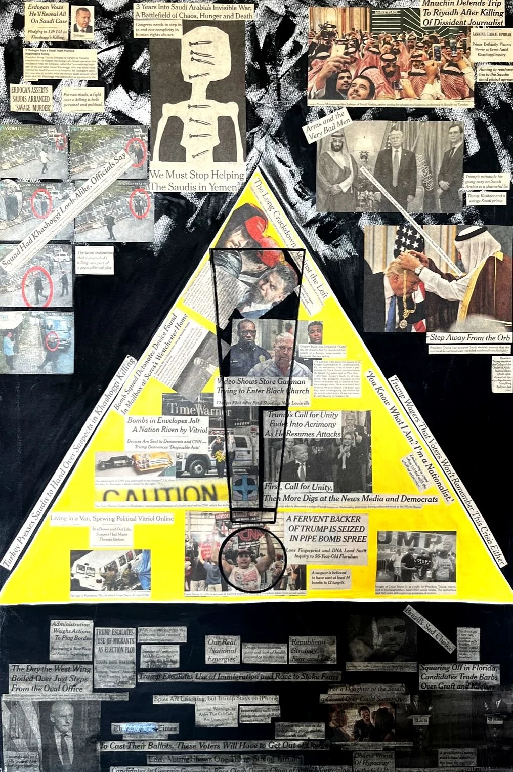 This week’s collage spotlights the gruesome murder of journalist Jamal Khashoggi, escalating violence from far-right extremists, and the Trump administration’s unapologetic embrace of Saudi wealth and power. With global outrage rising, the triangle warns: when violence, silence and greed align, proceed with caution.